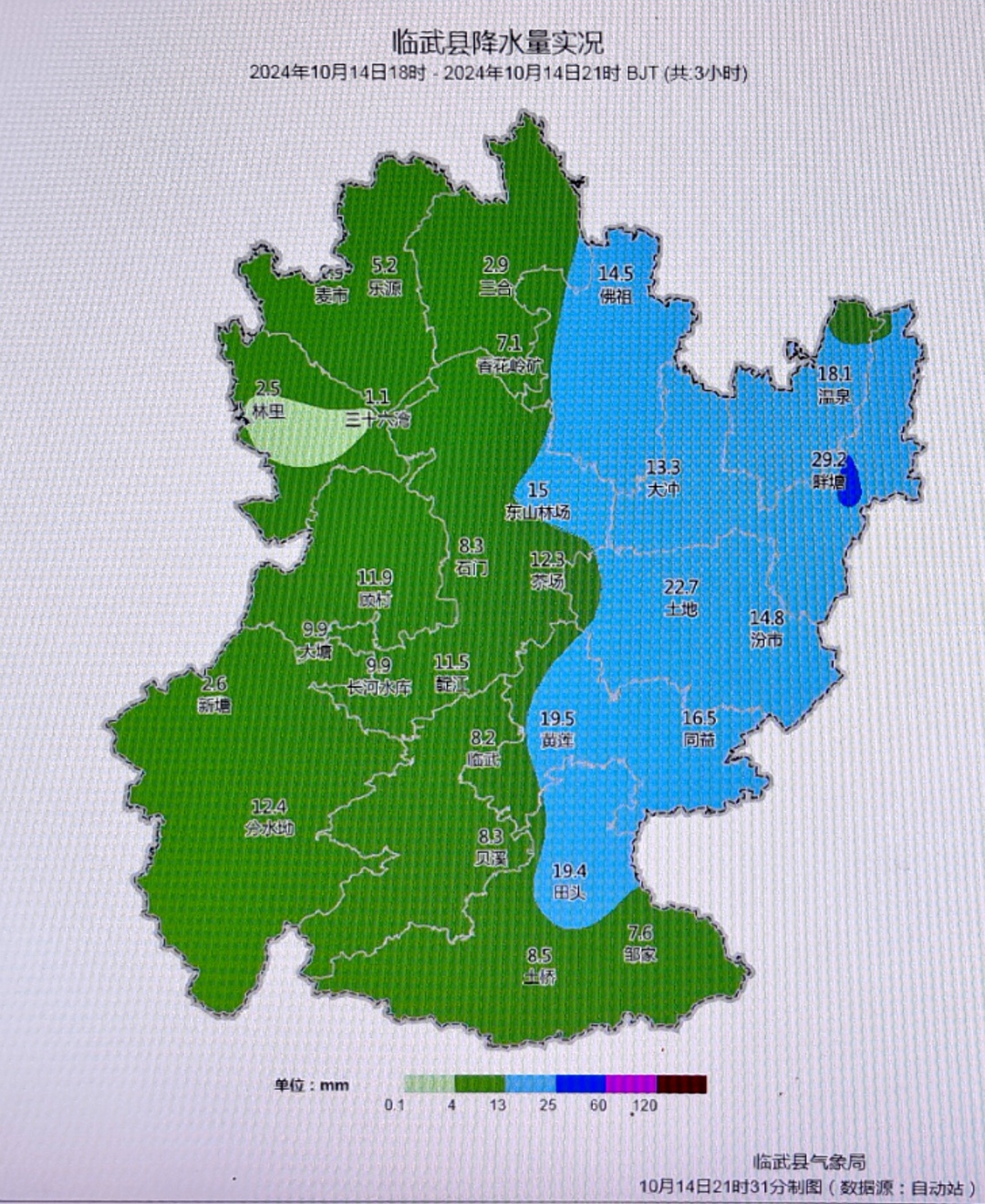 14日18时开始我县局地生成回波,自西向东降雨发展,18时至21时全县平均降雨11.5毫米,最大降水为水东镇畔塘站29.2毫米,最大小时雨强27.8毫米(水东镇畔塘站,14日20时-21时)。