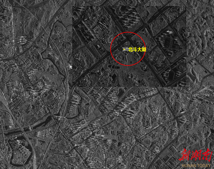 一张从SAR卫星返回的株洲北斗产业园灰度图像上,北斗大厦比周边建筑更亮、更白。“因为北斗大厦的外壳是金属材质,可以通过遥感成像分析出来。”汤大权说,SAR卫星可不受天气、光照的影响,实现全天时、全天候成像,透过地表或植被探测到被遮蔽的地物信息,从丰富的雷达信息中反演地物类型或地形地表。