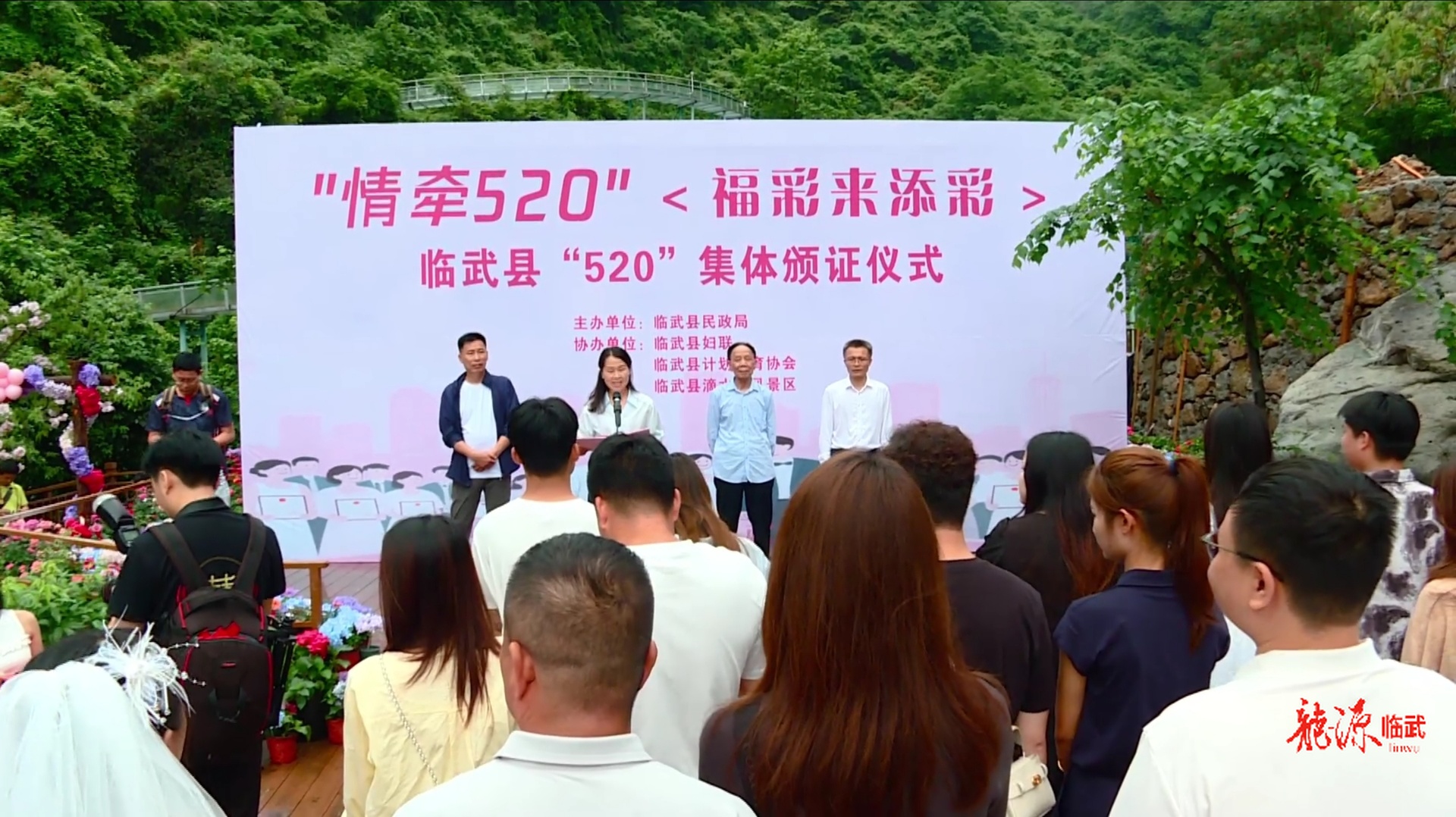 龙源临武客户端5月20日讯(记者 李亚鹏)5月20日,在这个充满爱意的特殊日子里,由临武县民政局主办,临武县妇联、临武县计生协会协办的“情牵520·福彩来添彩”集体颁证活动在滴水源景区举行,为12对新人打造了一场难忘的颁证仪式。