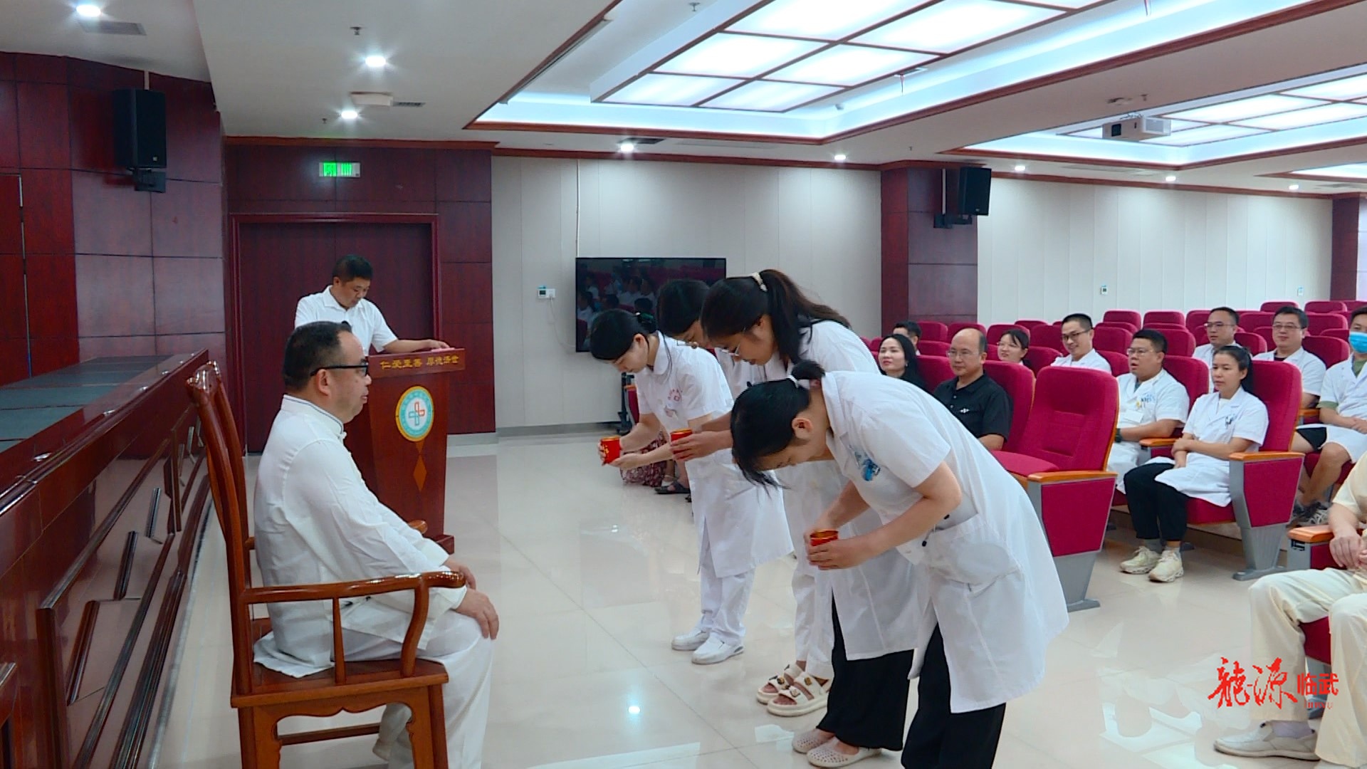 在临武县中医医院多功能报告厅,6位来自内科、外科、儿科等科室的中医名师端坐太师椅,青年医师依次上前,行传统拜师礼,通过庄重的仪式,彰显矢志传承中医药事业的决心。
