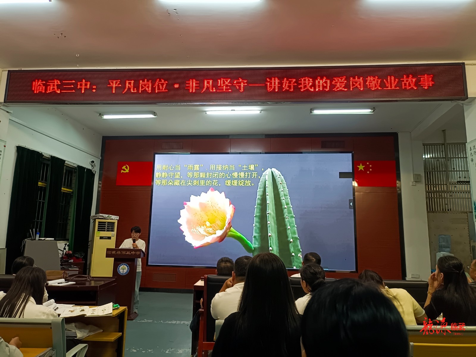 龙源临武客户端9月24日讯(通讯员 周春艳)9月22日,临武县第三中学积极响应县教育局关于开展“平凡岗位·非凡坚守——讲好我的爱岗敬业故事”主题分享活动的号召,利用每周例会时间组织全体教职工开展主题分享会。