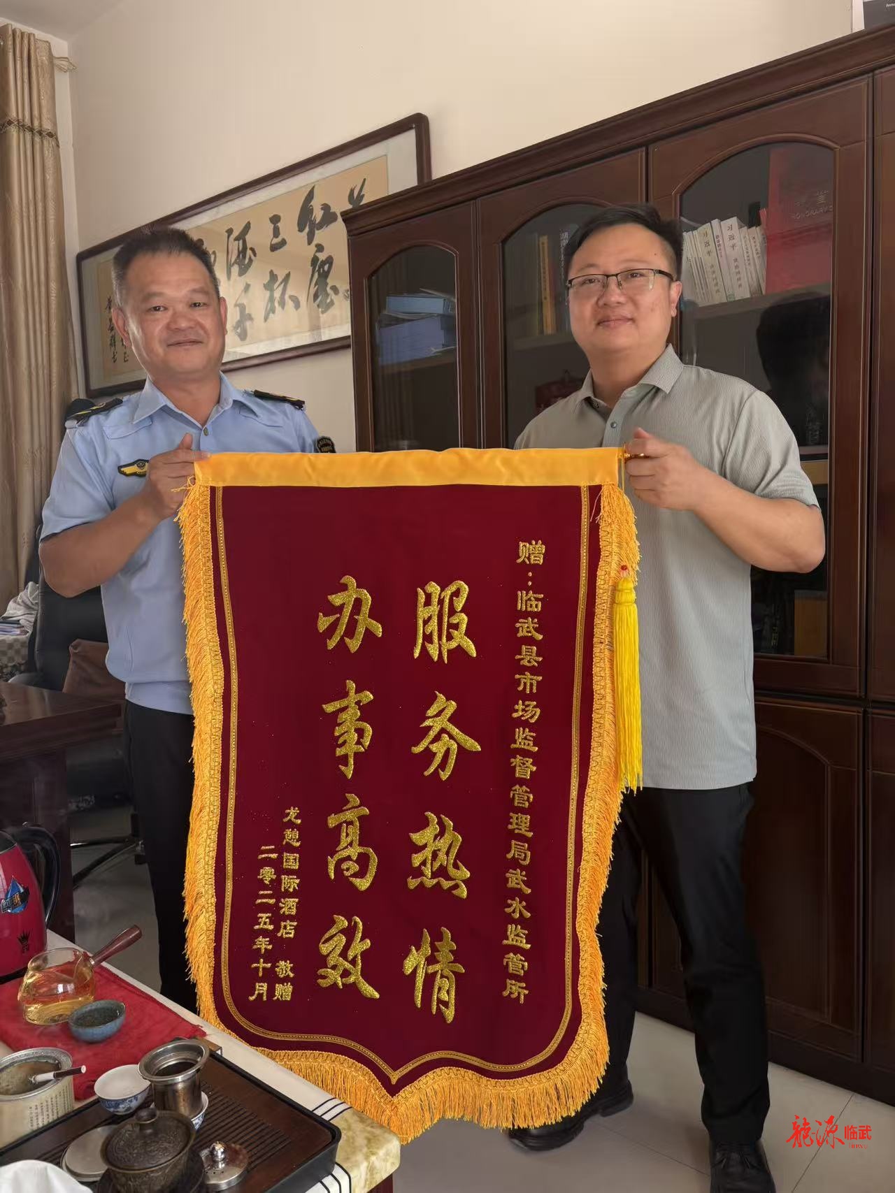 龙源临武客户端10月21日讯(通讯员 陈瀚博)近日,临武龙憩国际酒店将一面印有“服务热情 办事高效”字体的锦旗,送给临武县市场监督管理局武水监管所,感谢其在“星野露天餐吧”项目落地中提供的精准高效服务……这是该局主动服务市场主体、优化营商环境助力“烟火经济”发展的一个生动体现。