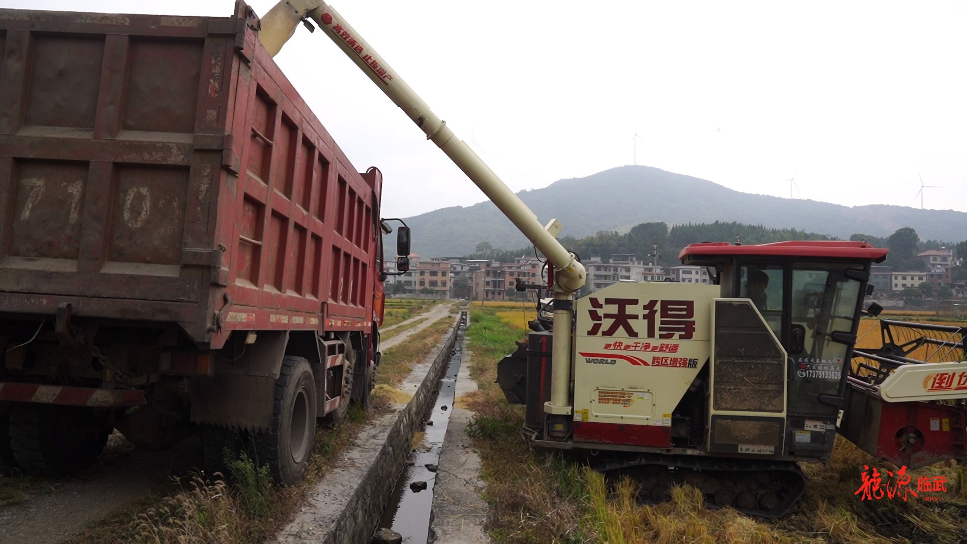 在水东镇水东村的千亩稻田里,收割机正开足马力,机械所到之处,沉甸甸的稻穗顷刻间就能完成脱粒、分离等工序,金灿灿的谷粒进入运粮车中。