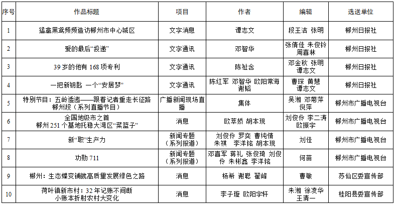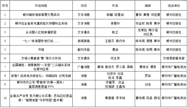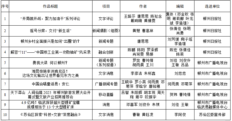 根据《关于开展2025年度郴州新闻奖、郴州市优秀新闻工作者评选工作的通知》精神,经各县市区委宣传部、市直新闻单位推荐,评委评审,评出一等奖10件、二等奖20件、三等奖30件。