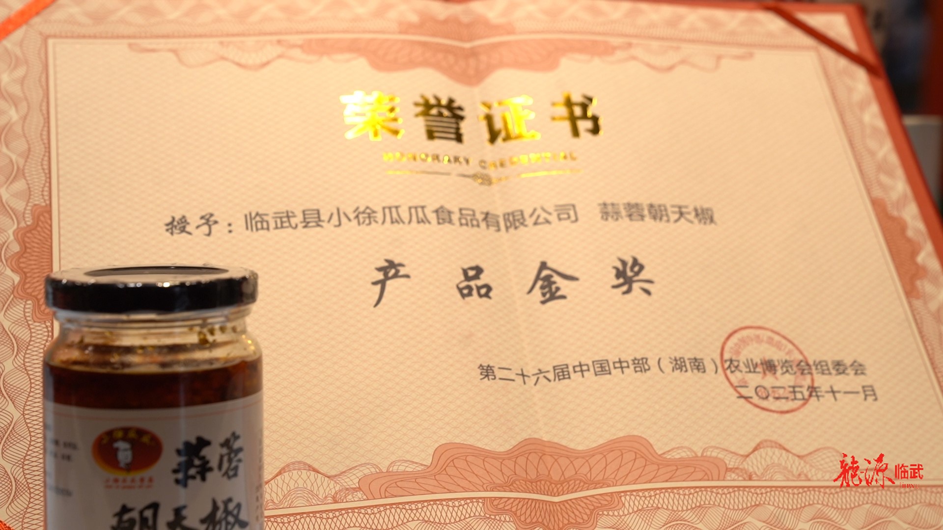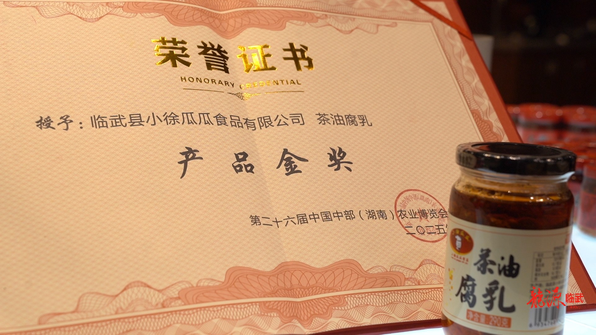 龙源临武客户端11月21日讯(记者 徐杨政)近日,第二十六届中国中部(湖南)农业博览会总结大会在长沙国际会展中心举行。临武县小徐瓜瓜食品有限公司选送的“茶油腐乳”与“蒜蓉朝天椒”两款产品,双双斩获本届农博会产品金奖,标志着临武县本土农产品在精深加工与品牌化发展道路上迈出了坚实一步。