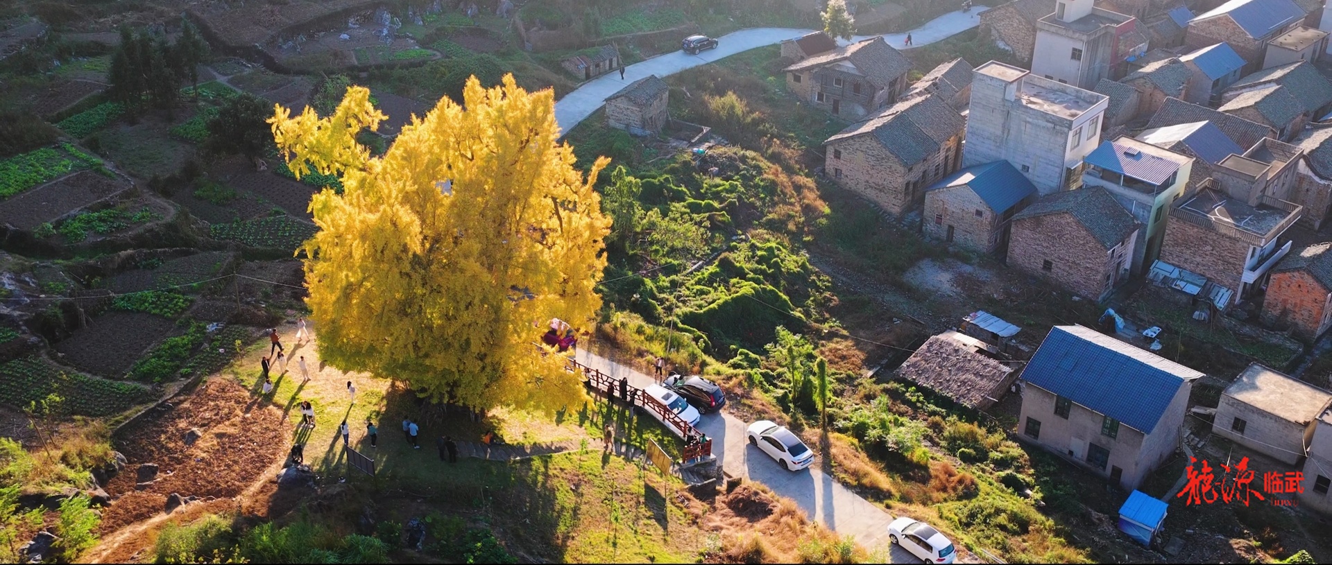 龙源临武客户端11月26日讯(记者胡章 邓圣立 王思州)初冬已至,临武县万水乡上潢村500岁的古银杏盛装登场!满树鎏金,灿若云霞,这棵历经沧桑的巨树迎来了它一年中最绚烂的时刻,也让静谧的古村变得游人如织,热闹非凡。