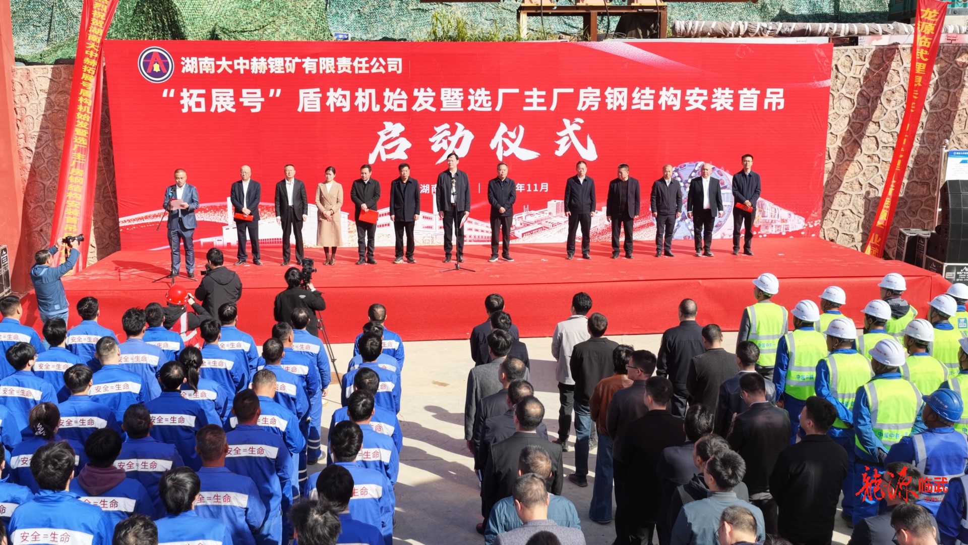 龙源临武客户端11月27日讯(记者 徐杨政 胡懿)11月27日,湖南大中赫锂矿有限责任公司举行“拓展号”盾构机始发暨选厂主厂房钢结构安装启动仪式,两个项目的同步启动标志着湖南大中赫锂矿有限责任公司在临武县投资建设的锂电新能源全产业链项目正式迈入高质量发展新阶段。县委书记刘杨出席活动并宣布项目正式启动。湖南大中赫锂矿有限责任公司董事长张杰出席活动。