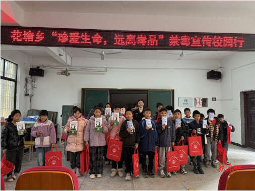 龙源临武客户端12月4日讯(通讯员 钟素斌)为进一步加强青少年毒品预防教育,提升在校学生识毒、防毒、拒毒的意识和能力,筑牢校园禁毒防线,12月4日,临武县花塘乡禁毒办联合乡司法所、志愿者到花塘学校开展“珍爱生命 远离毒品”禁毒宣传教育活动。