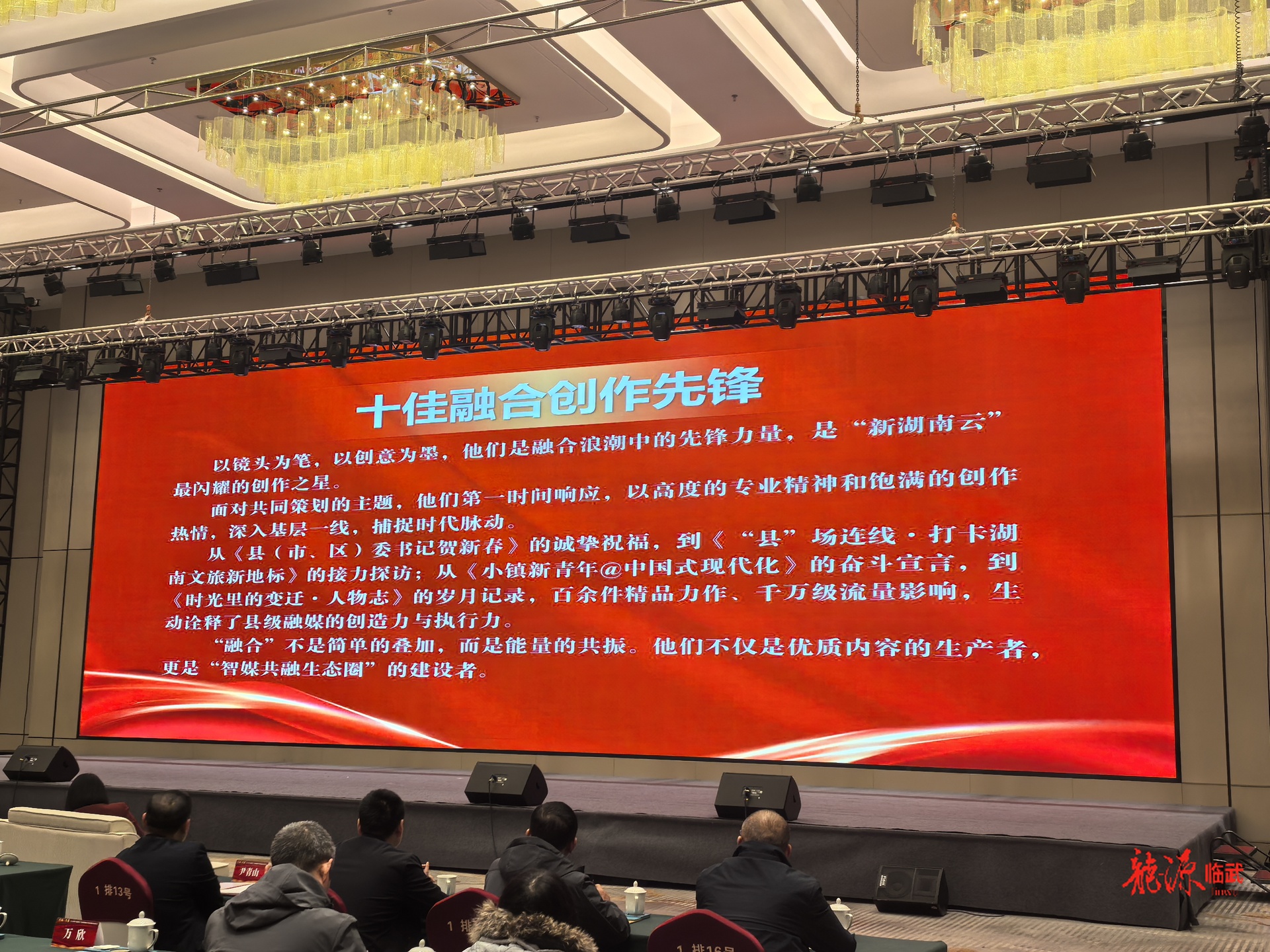 龙源临武客户端12月18日讯(记者 蒋淑芬)12月18日,2024年度“新湖南云”县级融媒融合发展成果评选发布会在永州祁阳市举行。临武县融媒体中心获评2024年度“新湖南云”县级融媒“十佳融合创作先锋”,这是该中心连续四年荣获“新湖南云”县级融媒“十佳融合创作先锋”称号。