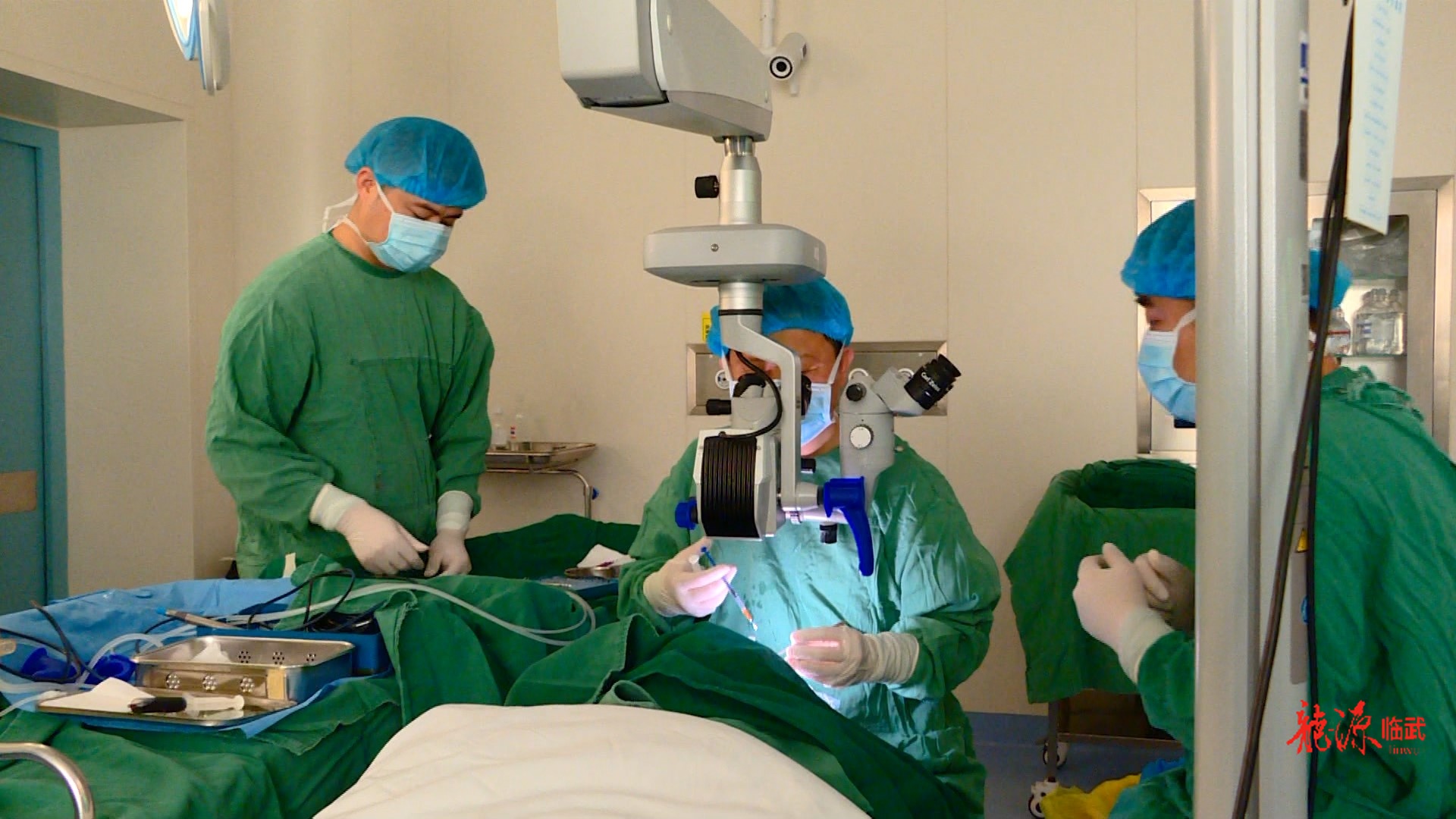 在县人民医院手术室里,11名白内障患者在医护人员引导下轮流接受手术。他们当中,年龄最大的90岁,最小的也已年过半百,大多因家庭困难,迟迟未能得到治疗。