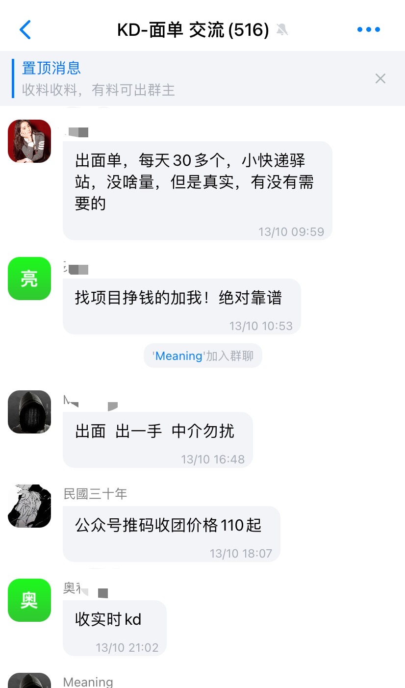 记者在群内观察发现,该群取“快递”拼音首字母,名为“KD-面单交流”,潜伏着大量出售、收购各类个人快递信息的用户。群主更是置顶消息:“收料收料,有料可出群主。”