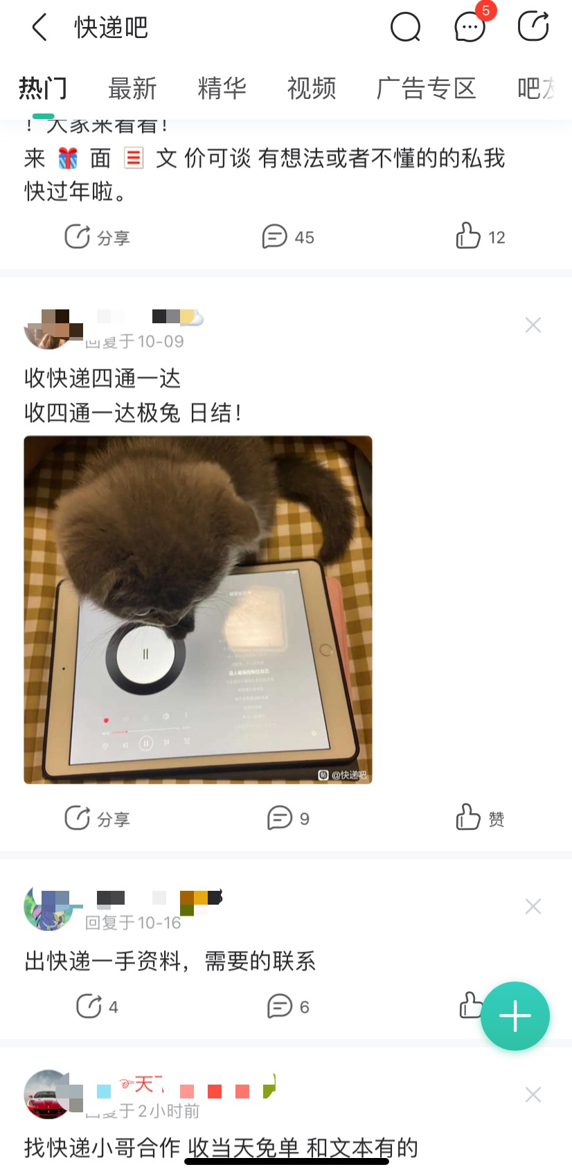 在百度贴吧“快递吧”“电子面单吧”“圆通吧”“快递员吧”等社群,出售和收购用户快递面单的网帖比比皆是。在“圈内”,快递信息被称为“料子”,面单也多被“KD”“MD”等简称代替,一条出料的网帖下会有多个收料的人留言或私信询价。