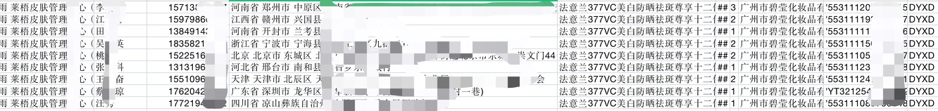常景山以每单2元的价格向记者出售了10条样货,显示为9月8日在广东广州市某化妆品公司抖音店下单,向全国各地买家发出的申通快递用户信息。