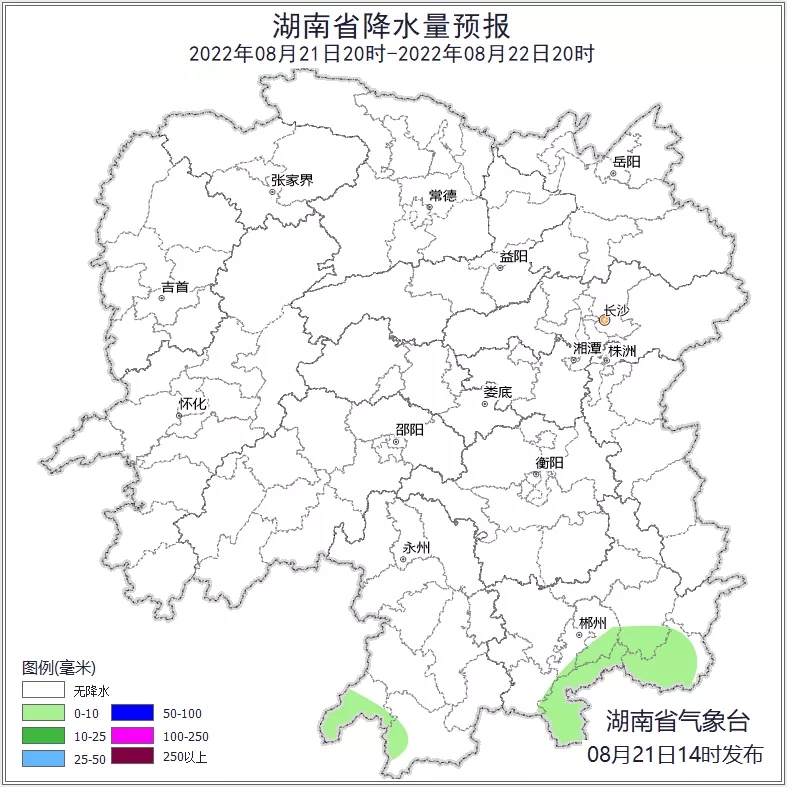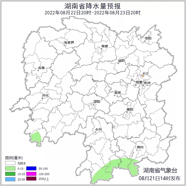 21日20时至22日20时,晴天间多云,永州南部、郴州南部局地有阵雨或雷阵雨,最高气温38~40℃。22日20时至23日20时,晴天间多云,怀化南部、郴州南部、永州南部局地有阵雨或雷阵雨,最高气温38~40℃。23日20时至24日20时,晴天间多云,邵阳南部、郴州南部局地有阵雨或雷阵雨,最高气温38~40℃。