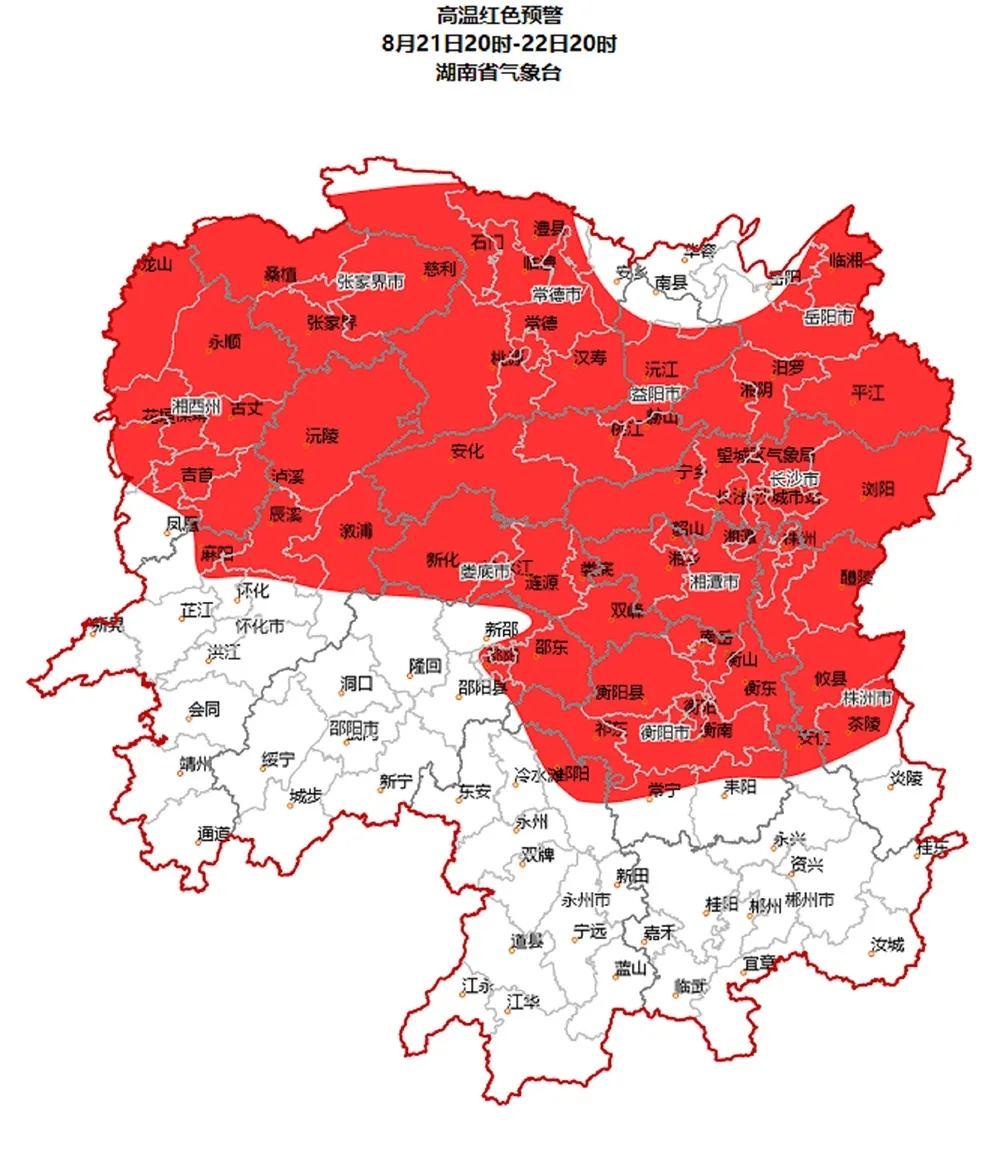 一直等不到下雨降温的信息,等来的却是一个个高温红色预警。省气象台今天又发布高温红色预警:预计21日20时至22日20时,长沙、株洲、湘潭、衡阳、邵阳东北部、岳阳、常德、张家界、益阳、怀化东北部、娄底、湘西土家族苗族自治州将达到39℃以上高温,局部地区将达40℃以上。截至目前,湖南已连续7天发布高温红色预警。