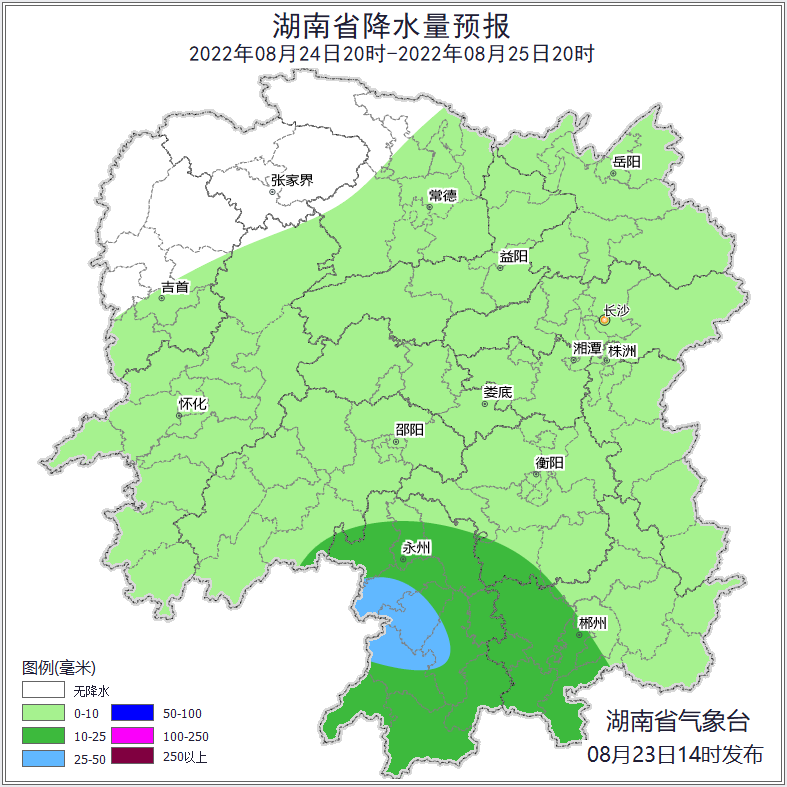 24日20时至25日20时,张家界、湘西土家族苗族自治州北部多云间阴天,其他地区阴天有阵雨或雷阵雨,其中永州、郴州西部、衡阳南部局地中到大雨;最高气温湘西35~37℃,其他地区32~34℃。
