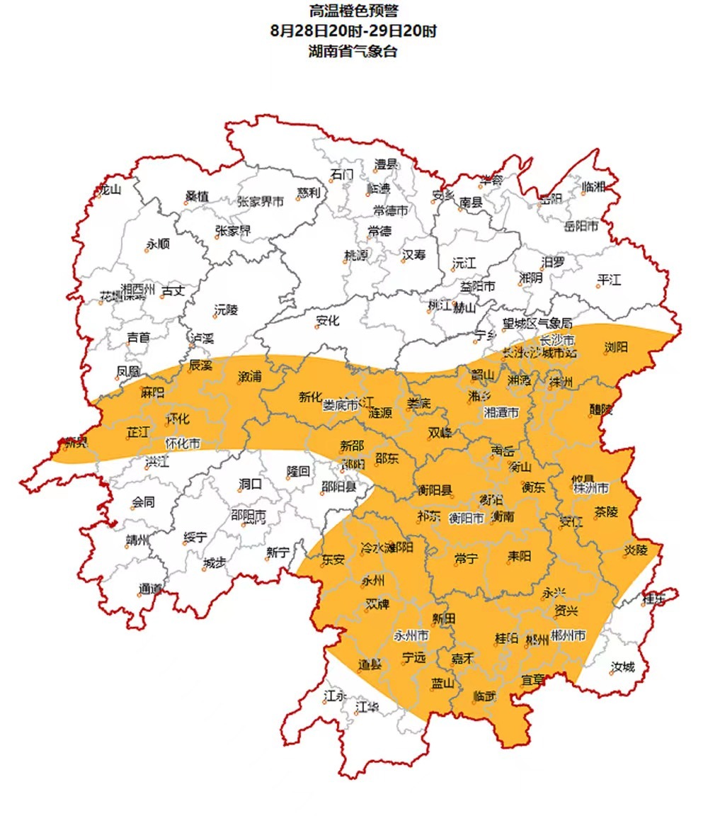 湖南日报8月28日讯(全媒体记者 胡盼盼 通讯员 张倩)省气象台今天16时发布高温橙色预警:预计28日20时至29日20时,长沙东部、株洲、湘潭、衡阳、邵阳北部、郴州、永州、怀化中部、娄底将达到37℃以上高温,局部地区将达39℃以上,请做好防范。