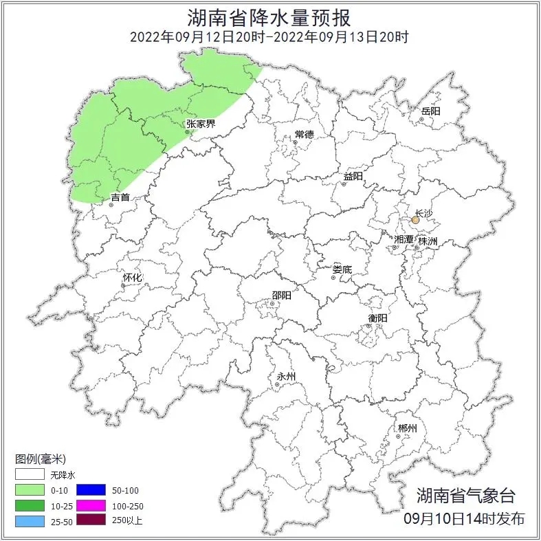 具体预报:10日20时至11日20时,多云间晴天,其中湘西土家族苗族自治州南部、怀化中南部局地有阵雨;最高气温湘西32~34℃,其他地区34~36℃。 11日20时至12日20时,多云间晴天,其中湘西土家族苗族自治州北部、张家界北部、常德北部局地有阵雨;最高气温34~36℃。12日20时至13日20时,多云间晴天,其中湘西土家族苗族自治州中北部、张家界北部、常德北部局地有阵雨;最高气温33~35℃。