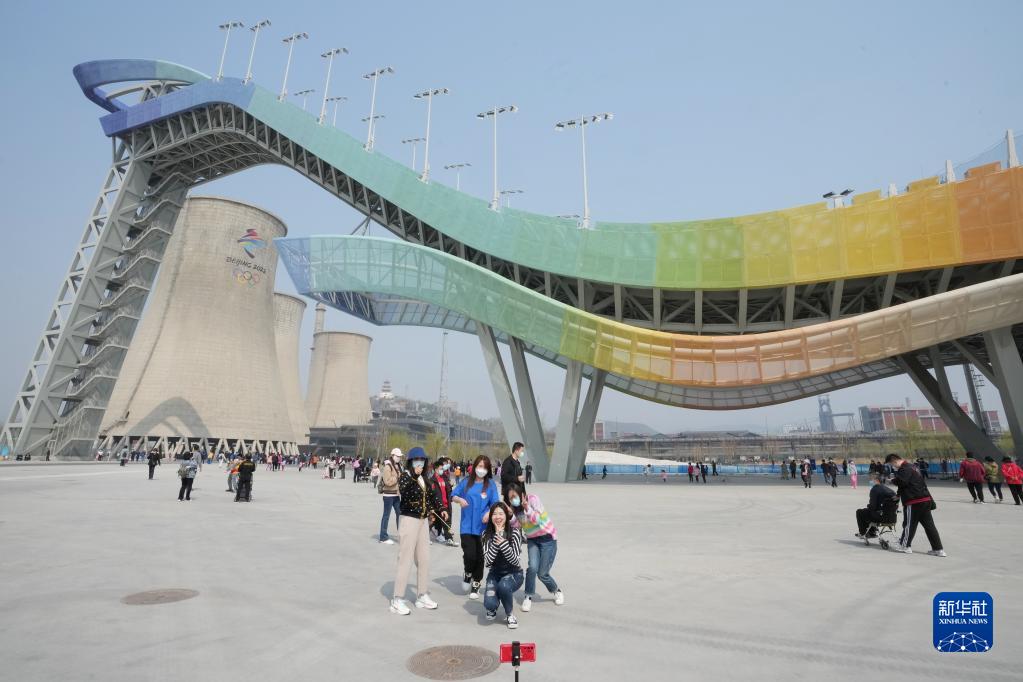 游客在北京首钢滑雪大跳台区域参观游览(2022年4月4日摄)。新华社记者鞠焕宗摄