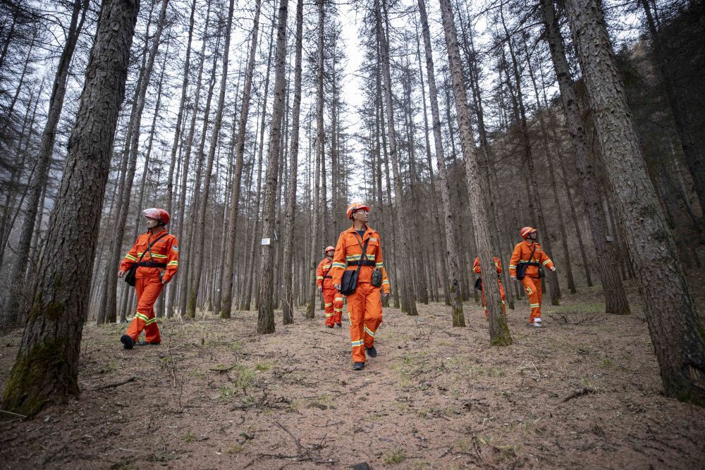 宁夏固原市六盘山林业局二龙河国有林场的工作人员在所辖林区进行防火巡护巡查(2022年3月17日摄)。新华社记者 杨植森 摄