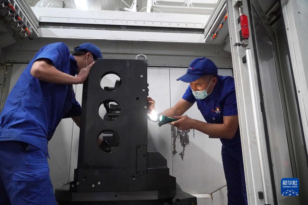 在山东省潍坊市,潍柴集团的工作人员在一条新的生产线上安装调试设备(9月19日摄)。新华社记者 徐速绘 摄