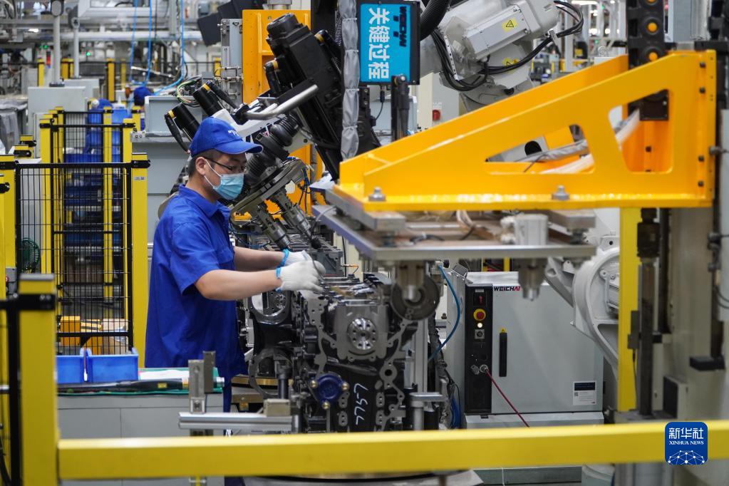在山东省潍坊市,潍柴集团的工作人员在发动机生产线上工作(9月19日摄)。新华社记者 徐速绘 摄