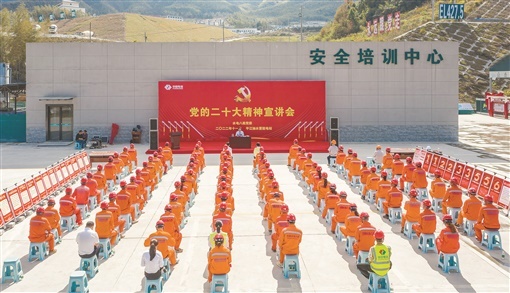 在宽敞的露天广场上,建设者们身着橙色制服、佩戴党徽,整齐列坐,中国水电八局党的二十大精神宣讲会开始了!