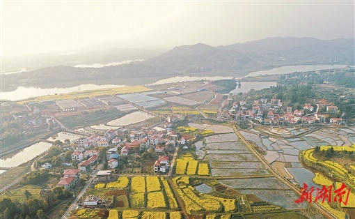 冬天,祁阳市茅竹镇三家村。村旁,绕村北上的湘江碧波荡漾,两岸色彩斑斓。村中,游人有的在游道漫步,有的在拓展基地一试身手,有的在党的二十大精神宣传栏前阅读……