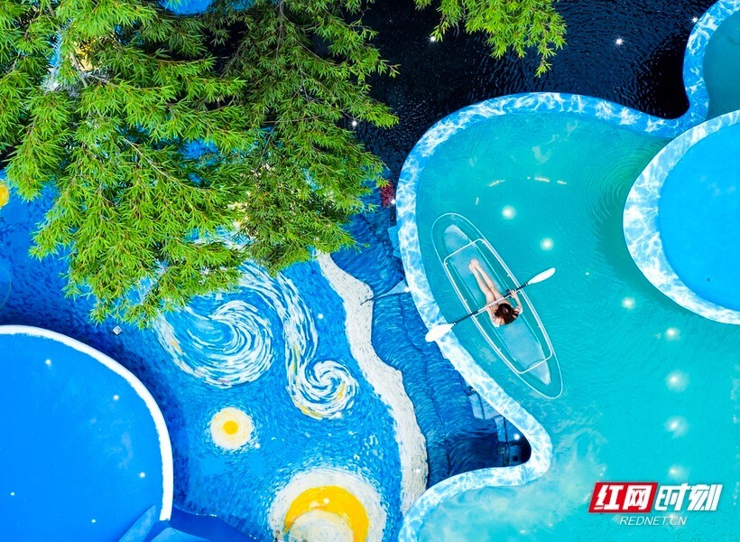 还有不规则形状的天碗星空池,海底蓝配以独特彩绘,是完全不需要滤镜的拍照胜地。你还能在“碗中”划船,躺在网红玻璃船中,享受森林的静谧,呼吸着负离子满满的新鲜空气。