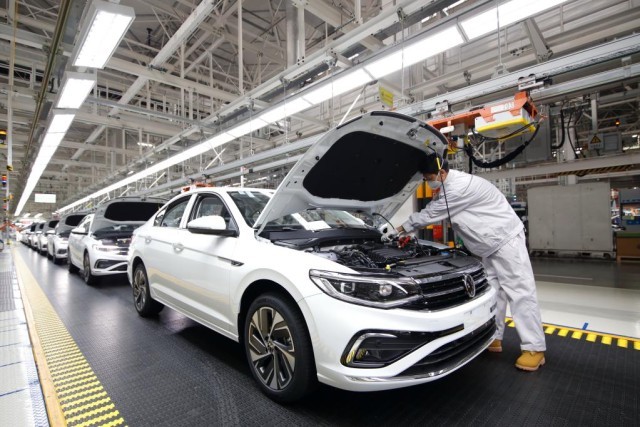 2022年12月20日,在位于山东省青岛市即墨区的一汽—大众华东基地总装车间,工人在装配汽车。新华社发(梁孝鹏摄)