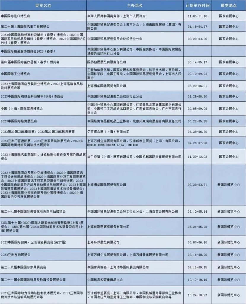 第二十届上海国际汽车工业博览会、2023中国国际纺织面料及辅料(春夏)博览会、第87届中国国际医疗器械(春季)博览会等一批重量级国际知名展会将在2023年精彩亮相。