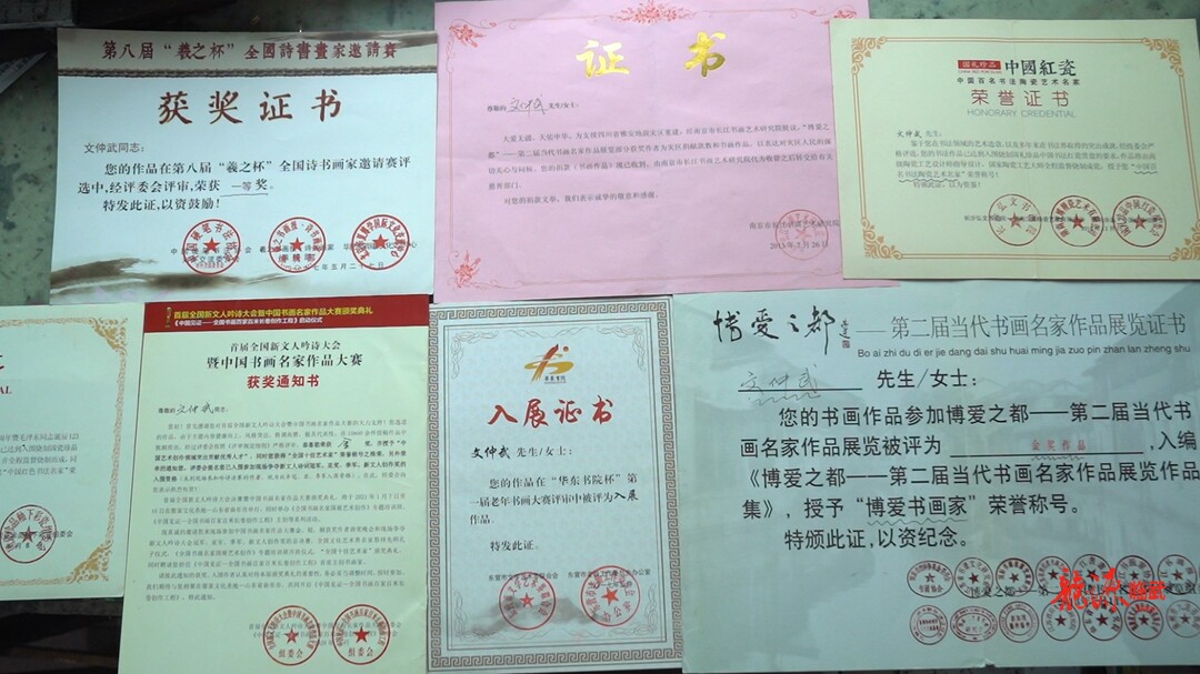 一分耕耘一分收获。正是文仲武这份对绘画的执着,他在艺术创作的道路上也收获颇丰,近年来,文仲武的书画作品在全国和全省的书画大赛中多次获奖。他的书法作品七律诗《咏羊》在2017年第八届“羲之杯”全国诗书画家邀请赛中荣获一等奖,被授予“中华老年兰亭文艺家”荣誉称号。中国画《奔马》在2021年首届全国新文人吟诗大会暨中国书画名家作品大赛中荣获金奖,并被授予“全国十佳艺术家”荣誉称号。2017年,他被聘请为中国诗书画家网高级诗词家、高级书画家。