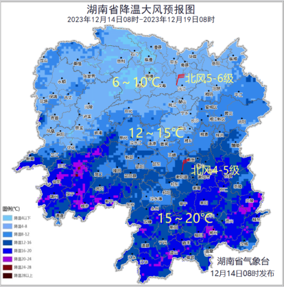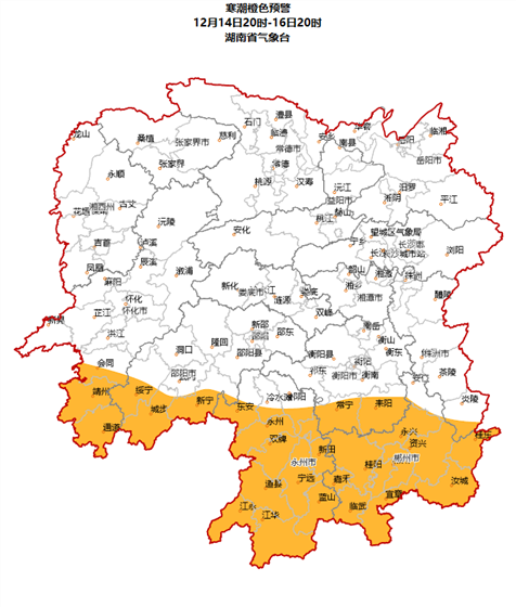 湖南省气象台12月14日16时发布寒潮橙色预警:预计14日20时至16日20时,衡阳南部、邵阳西南部、郴州、永州、怀化西南部最低气温将下降12℃以上,最低气温≤4℃,并可能伴有5级以上偏北大风,请注意防范。