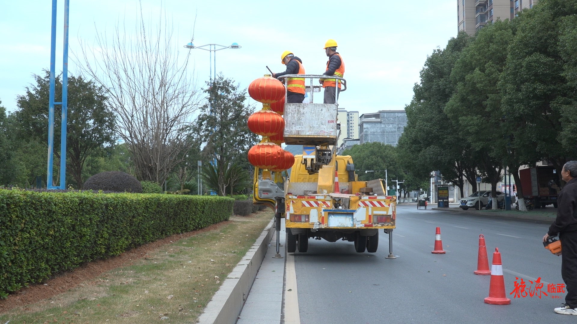 在县城区主干道,工人们正有条不紊地忙碌着。这边将崭新的红灯笼卸车拆封、整理挂件,做好安装准备;另一边,高空作业车升起,工人师傅们仔细调整着灯笼的位置和角度,确保每一盏都悬挂得整齐美观、安全牢固。除了红彤彤的灯笼,工作人员还在迎宾广场、舜峰广场等人流密集区域精心布置了色彩缤纷的年宵花卉,为冬日增添了一抹亮丽的暖意。