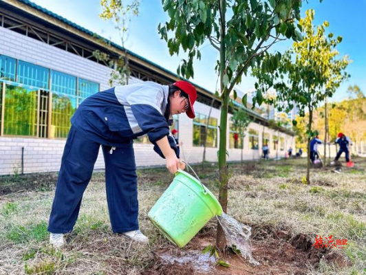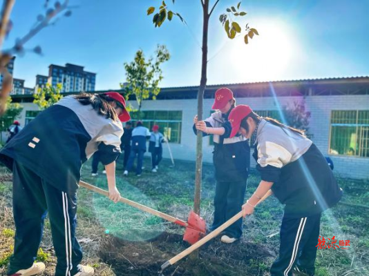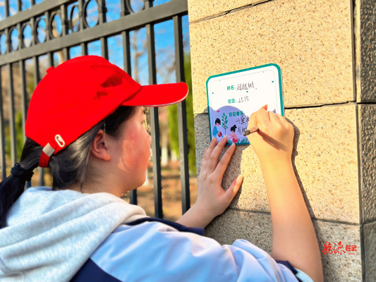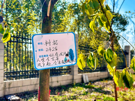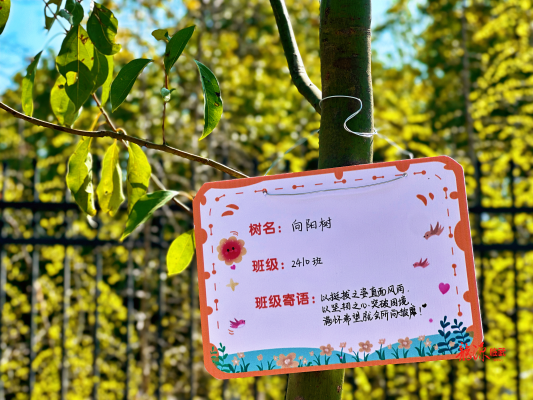 活动现场,志愿者们分工协作,挥锹铲土、扶苗填坑、提水浇灌等每个环节都一丝不苟,50棵寄托着希望与梦想的樟树苗昂然挺立,为初春的校园增添了勃勃生机。其间,同学们还为自己的班级树挂上专属铭牌,写下专属树名和班级寄语,自我鞭策将与树苗一同成长,扎根大地,向阳而生。