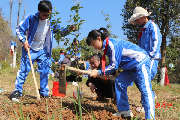 随着一声令下,寂静的山坡瞬间热闹起来:党员教师身先士卒,挥锄挖坑;少先队员不甘示弱,小心翼翼扶正树苗;女生们组成“护绿小分队”,来回穿梭提水浇灌……现场分工有序,配合默契,株株新苗迎风挺立,为初春的山坡增添了勃勃生机。