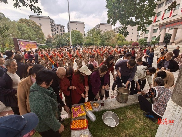 龙源临武客户端3月17日讯(通讯员 郑飞鹰)饺香寄深情,热血赴军营。3月16日,临武县人武部院内暖意融融,身着戎装、胸戴大红花的新兵们精神抖擞意气风发,他们肩负家乡重托奔赴军营献身国防,欢送现场出现暖心一幕:新兵家长自发筹备,为即将出征的孩子们送上热气腾腾的“壮行饺子”,用最朴实的民俗与最真挚的关爱,为儿女壮行。