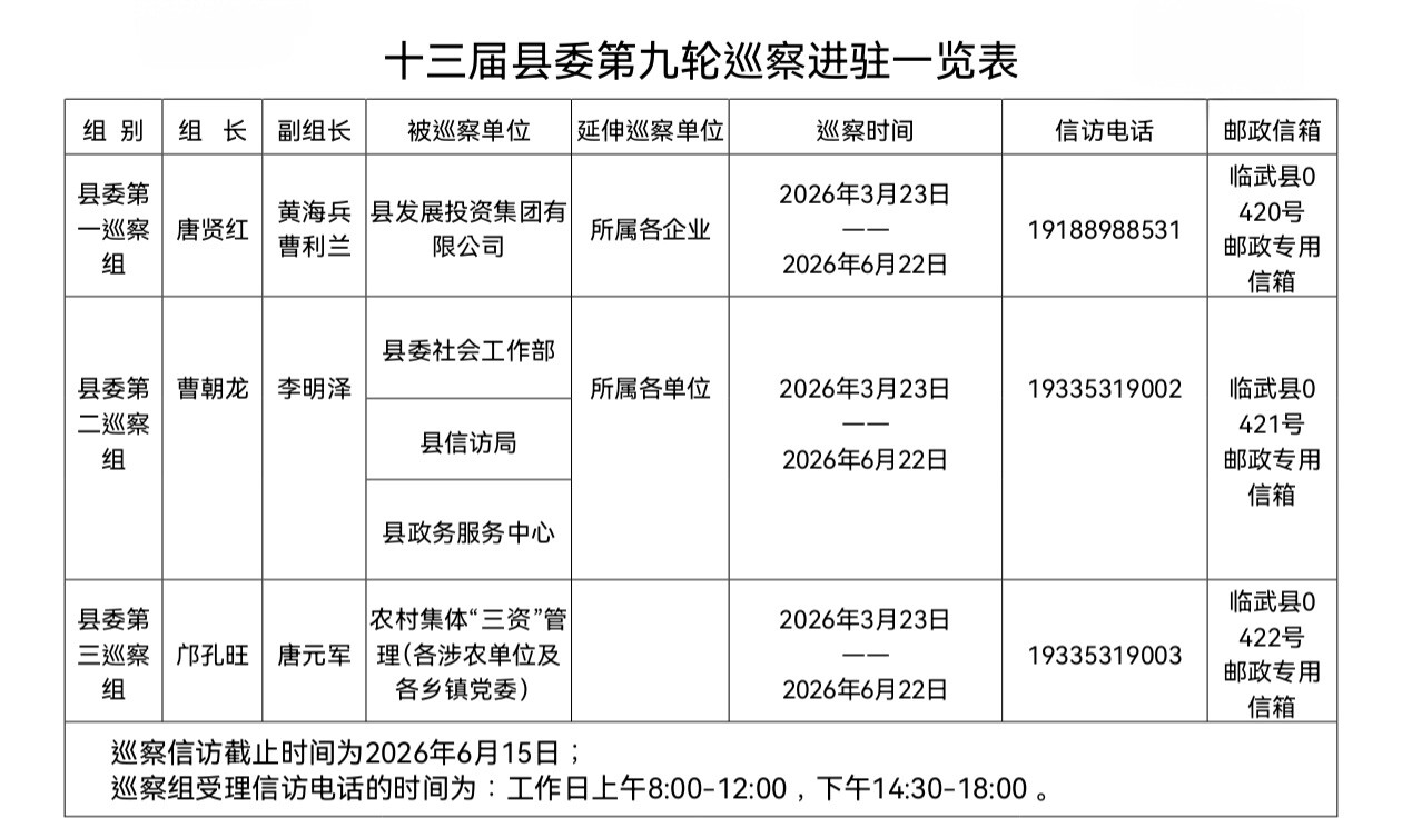 十三届临武县委第九轮巡察完成进驻 (附各巡察组联系方式)